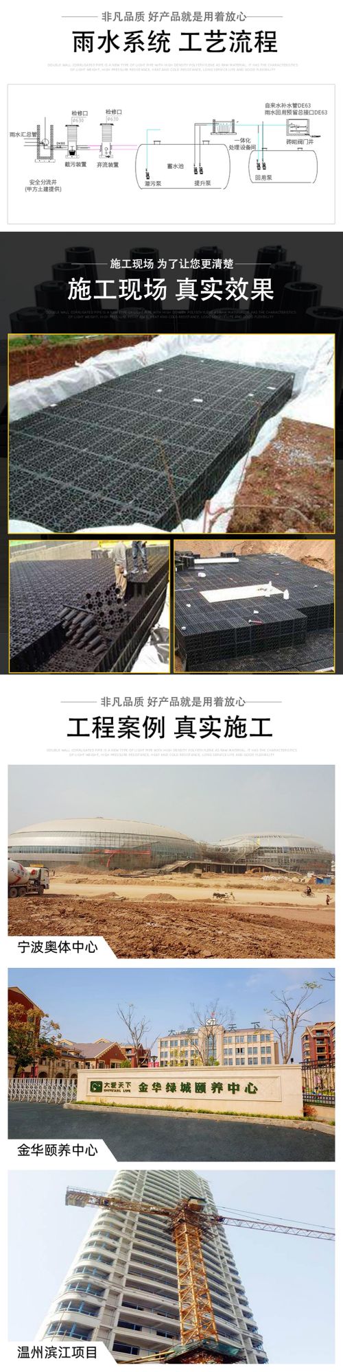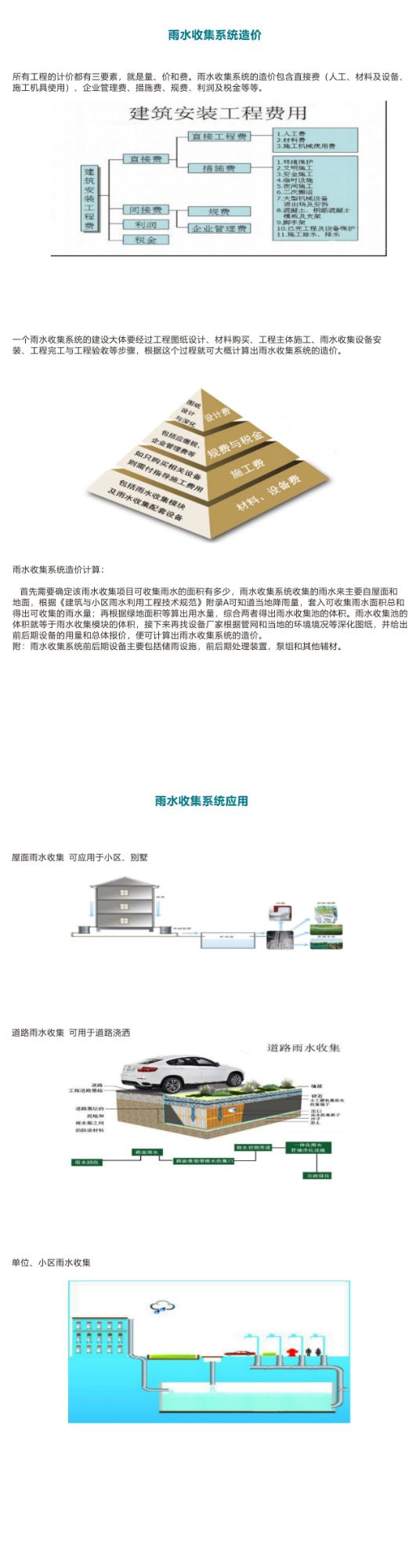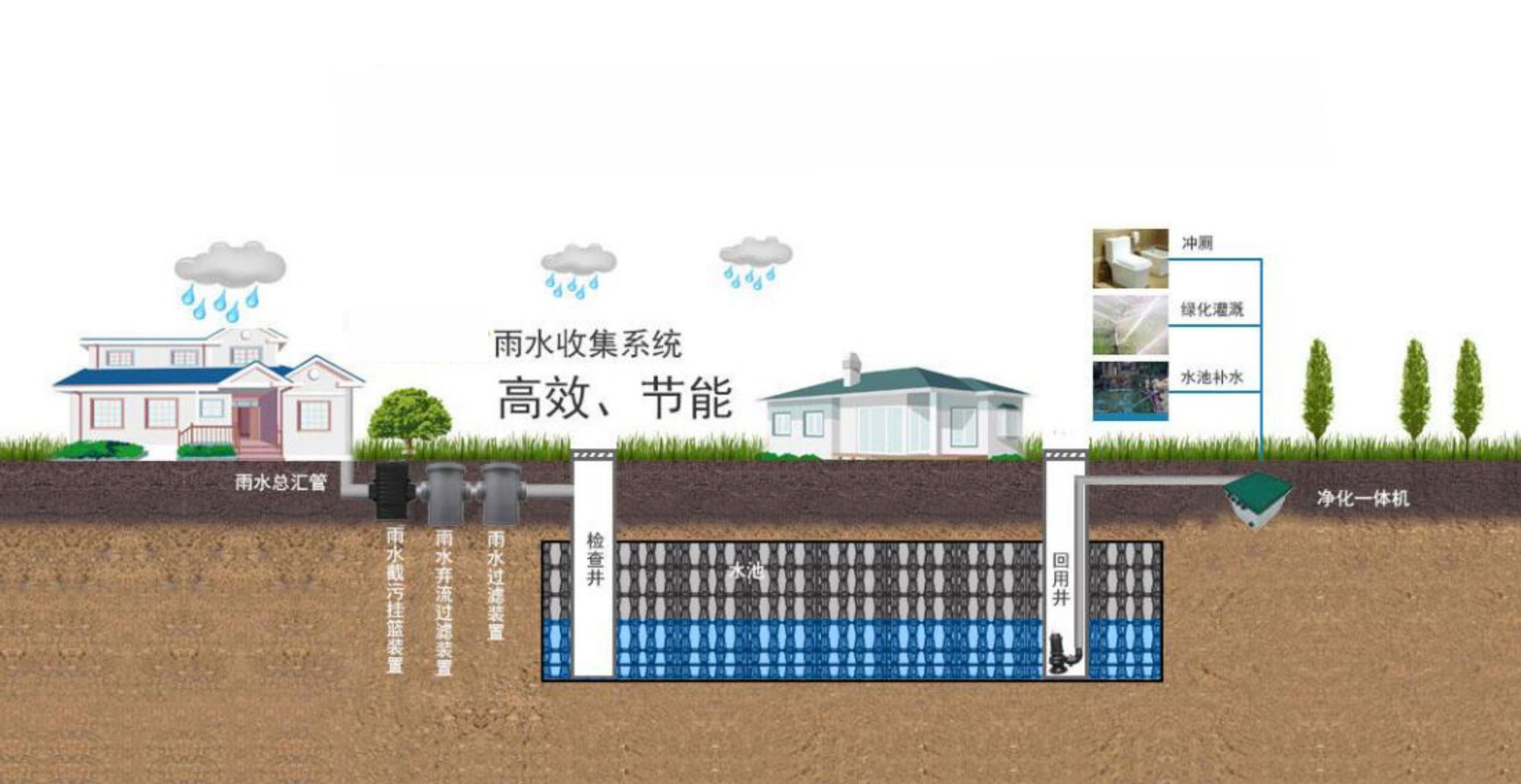 完整的雨水收集系統(tǒng)包括初期棄流過濾設(shè)備--PP模塊蓄水池--反沖洗裝置--后期消毒過濾設(shè)備,雨水經(jīng)過以上處理后可用于綠地灌溉、景觀用水、沖洗馬路等用途。